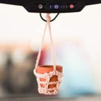 This cute hanging crochet oil diffuser is perfect for small spaces like campers, cars, or restrooms! Fill with pretty lava beads and add your favorite oils for a fresh scent, in a fun and adorable little pot! This pattern is FREE in-text. The ad-free PDF includes 2 additional designs: a key ring and a car coaster.